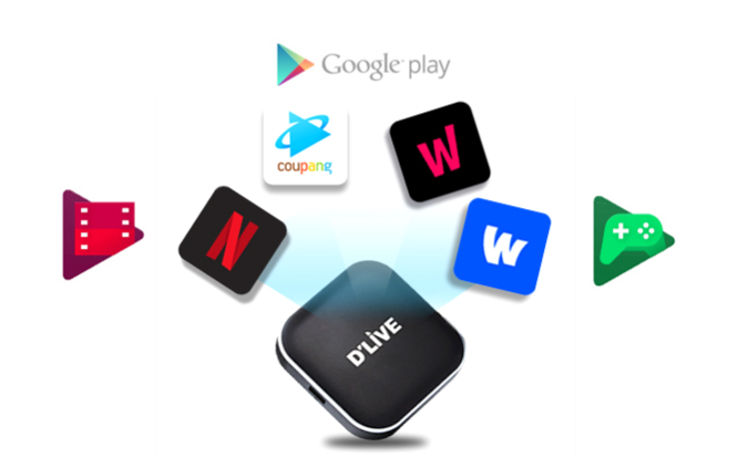 안드로이드 기반의 OS로 인터넷(핫스팟)만 딜라이브에 연결되면 일반 TV화면으로 넷플릭스와 유튜브와 게임앱까지 즐길 수 있습니다.